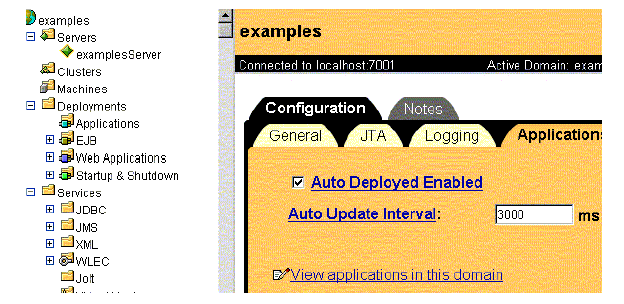 Para determinar si tenemos activado el despliegue autom�tico, llamamos a la Consola de Administraci�n y vamos a la p�gina de selecci�n de aplicaciones de dominio (Configuration --> Applications) del dominio. Esta p�gina nos permite activar o desactivar el despliegue autom�tico y seleccionar el intervalo (en milisegundos) en que el Servidor WebLogic chequer� para ver si hay nuevas aplicaciones en el subdirectorio \applications.
