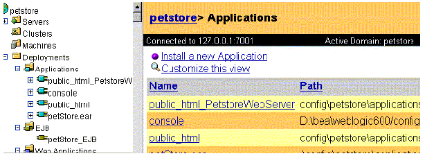 Usamos la p�gina Install an Application de la consola de administraci�n para copiar los ficheros de aplicaci�n J2EE (EAR), aplicaci�n Web (WAR), o EJB o JSP (JAR) a el directorio /config/domain_name/applications del Servidor de Administraci�n. Hay un enlace hacia la p�gina Install an Application desde la tabla de aplicaciones (ver figura de abajo), Web applications y EJB deployments. Accedemos a estas tablas seleccionando el contenedor adecuado en el panel de la izquierda.