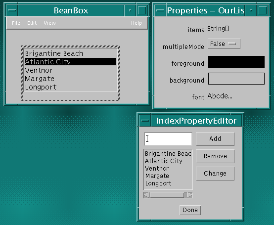 El Bean OurListBox proporciona un IndexPropertyEditor asociado que es un buen ejemplo de c�mo implementar un editor de propiedades indexadas. La siguiente ilustraci�n muestra un ejemplar de OurListBox en el BeanBox, la hoja de propiedades que contiene una entrada para los items de la propiedad indexada, y el IndexPropertyEditor que sale cuando se pulsa sobre los �tems de la propiedad.