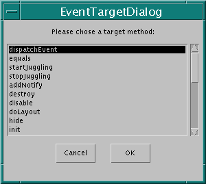 - El EventTargetDialog lista los m�todos que pueden aceptar ese tipo de eventos o que no tomen par�metros. Cuando se elige un m�todo en el EventTargetDialog, se est� eligiendo el m�todo que recibir� el evento lanzado, y actuar� sobre �l.