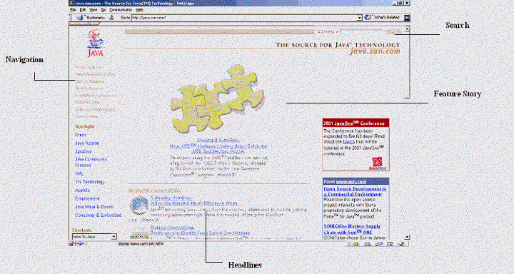 La siguiente figura muestra una captura de pantalla de la p�gina inicial de Sun, java.sun.com. Se identifican cuatro regiones: Navegaci�n, B�squeda, Contenido y Cabeceras. Aunque el contenido de cada una de estas subvistas podr�a estar originado desde diferentes fuentes de datos, se unen para crear un s�la p�gina compuesta.