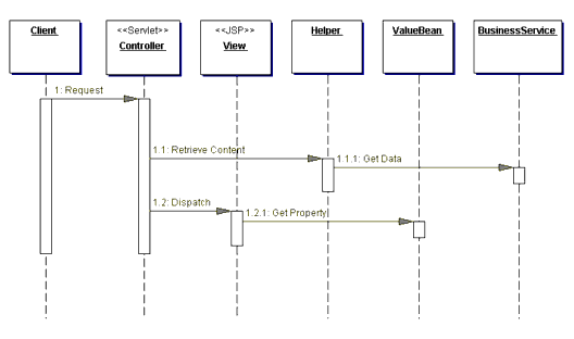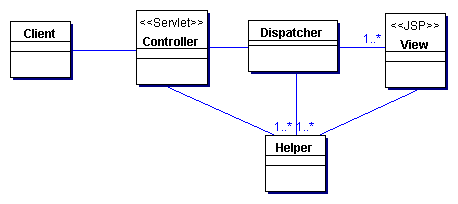 Una vista podr�a trabajar con cualquier n�mero de helpers, que normalmente est�n implementados por componentes JavaBeans (JSP 1.0+) o componentes de etiquetas personalidas (JSP 1.1+). Adem�s, un helper podr�a representar un objeto Command o delegate.