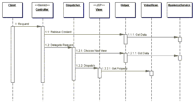 La siguiente figura muestra el diagrama de secuencia que representa al patr�n Service to Worker.