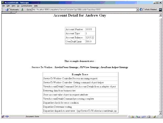 La invocaci�n del servicio de negocio mediante el delegado tiene que ver con un objeto Account Transfer, que el adaptador almacena en un atributo de la petici�n para utilizarlo en la vista. El siguiente ejemplo muestra accountdetails.jsp, la p�gina JSP que despachar� la petici�n. El objeto Transfer Object se importa mediante la etiqueta est�ndar <jsp:useBean> y se accede a sus propiedades utilizando la etiqueta est�ndar <jsp:getProperty>. La vista tambi�n utiliza una estrategia Composite muy simple, haciendo la inclusi�n de la subvista trace.jsp durante la traducci�n, est� subvista es la responsable de guardar informaci�n de la presentaci�n s�lo para prop�sitos de ejemplo.