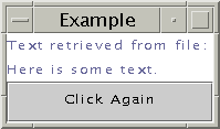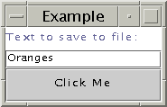 El programa FileIO muestra un sencillo interface de usuario que pide al usuario que introduzca alg�n texto. Cuando el usario pulsa el bot�n Click Me, el texto se graba en un fichero en el directorio home del usuario, y se abre y se lee un segundo fichero. El texto le�do del segundo fichero se muestra al usuario.