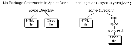 Esta etiqueta le dice al navegador que carge el applet cuya subclase Applet se llama AppletSubclass. La siguiente figura muestra d�nde debe estar el fichero de la clase del applet en relaci�n al documento HTML que contiene la etiqueta <APPLET>. Como muestra la figura, a menos que el applet sea declarado como pertenciente a un paquete, su clase debe estar en el mismo directorio que el fichero HTML que tiene la etiqueta <APPLET>.