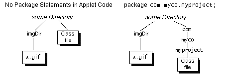 La clase Applet define formas convenientes de m�todos para cargar im�genes y sonidos que nos permiten especificar ficheros de im�genes y sonidos en relaci�n a un URL base. Por ejemplo, imaginemos un applet construido con la estructura de directorios que se ve en la siguiente figura: