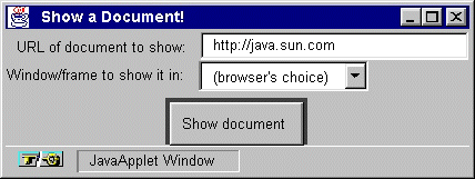 El siguiente applet nos permite probar todas las opciones de ambas formas de showDocument. El applet trae una ventana que nos permite teclear una URL y elegir cualquiera de las opciones de showDocument. Cuando pulsamos Return o pulsamos el bot�n Show document, el applet llama a showDocument.