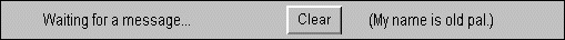 Pulsa sobre el bot�n Send message del applet de la parte superior (el Sender). En su ventana aparecer� alguna informaci�n de estado y el Receiver confirmar� (con su propia cadena de estado) que ha recibido el mensaje. Despu�s de haber le�do la cadena de estado del Receiver, pulsa el bot�n Clear para resetear el receptor. En el Campo de texto llamado "Receiver name:," del Sender, teclea buddy y pulsa Return. Como "buddy" es el nombre del propio Sender, �ste encontrar� un applet llamado buddy pero no querr� enviarle un mensaje porque no es un ejemplar de Receiver. |