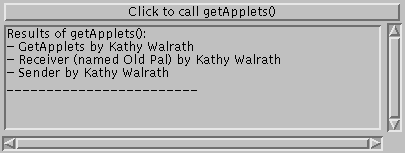 El m�todo getApplets devuelve una lista (una Enumeration, para ser precesisos) con todos los applets de la p�gina. Por razones de seguridad, muchos navegadores y visualizadores de applets implementan getApplets para que s�lo devuelva aquellos applets originarios del mismo host del applet que llam� a getApplets. Aqu� tenemos un applet que simplemente lista los applets que puede encontrar en esta p�gina: