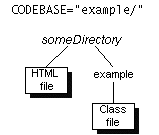 La siguiente figura muestra la localizaci�n del fichero class, en relaci�n al fichero HTML, cuando CODEBASE se selecciona como "example/".