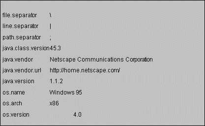 Los applets pueden leer algunas, pero no todas, las propiedades de sistemas. Esta p�gina lista las propiedades del sistema que Netscape Navigator 2.0 y el Applet Viewer permiten leer, seguido por una lista propiedades que los applets no pueden leer.