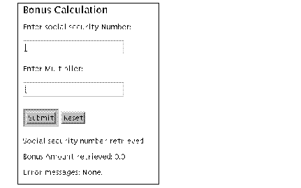 Social security number retrieved: <jsp:getProperty name="jbonus" property="socsec"/> <P> Bonus Amount retrieved: <jsp:getProperty name="jbonus" property="bonusAmt"/> <P> Error messages: <jsp:getProperty name = "jbonus" property="message"/>