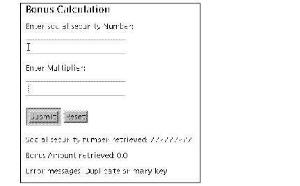 Cuando el usuario introduce alg�n dato y pulsa el bot�n Submit, se vuelve a mostrar el formulario HTML, y se ejecutan de nuevo los scriptlets y las etiquetas especificas JSP con los datos suministrados. La pantalla se parecer�a algo a la de la siguiente figura. Esto es porque el par�metro ACTION del formulario HTML de bonus.jsp se llama a s� mismo de forma recursiva.