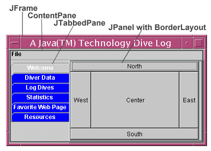 Igual que la ilustraci�n de arriba, la clase Welcome usa BorderLayout con s�lo tres de sus regiones ocupadas por objetos.
