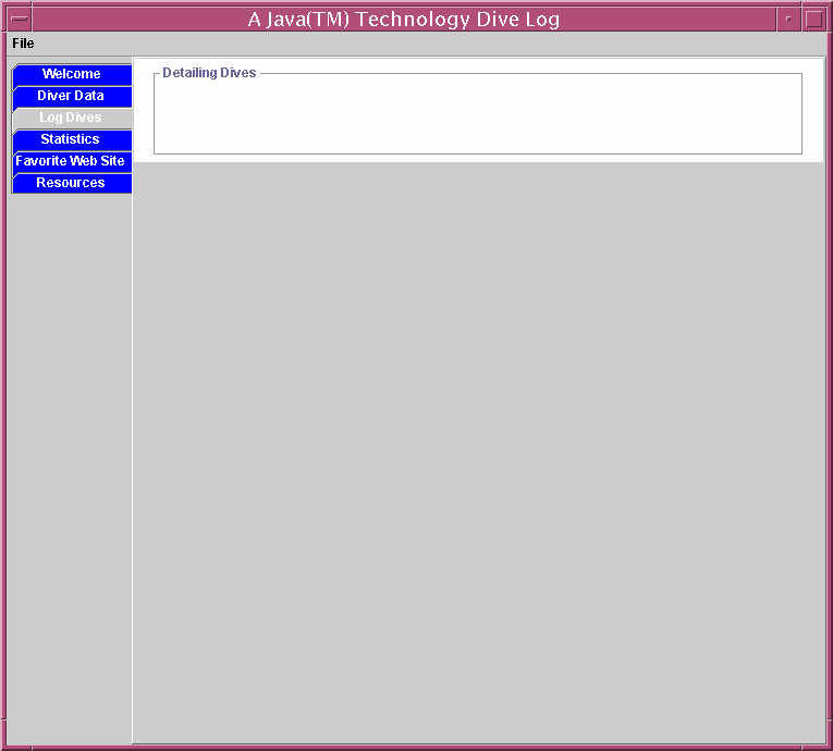 La clase NorthPanel est� completa y lee el fichero y muestra el texto en el �rea de texto de la regi�n norte del BorderLayout del objeto Dives. El objeto CenterPanel escribe experiencias de buceo en un fichero, e incluye lo siguiente: