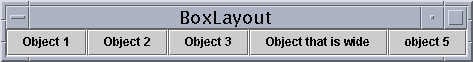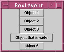 Un objeto Box es un contenedor de peso ligero que usa un objeto BoxLayout como su controlador de distribuci�n. En otras palabras, no necesitamos llamar al m�todo setLayout e inicializar la clase BoxLayout para este objeto particular. La clase Box proporciona varios m�todos que son �ltiles para contenedores que usan BoxLayout e incluso para contenedores que no son Box. Esto hace que tenga m�s sentido que aprendamos los m�todos est�ticos de la clase Box.