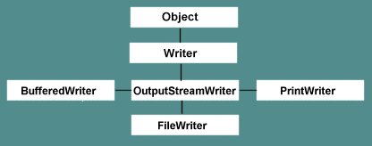 Escribir en un fichero funciona de forma similar a leerlos. Recuerda que un stream de datos es de entrada o de salida. Normalmente usamos dos streams a la vez: uno para leer y realizar la validaci�n (entrada) y otro para escribir (salida). Para crear un stream de salida, tenemos la clase Writer y sus descendientes: